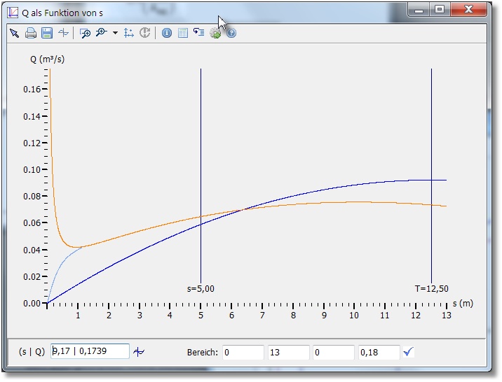 Alle wichtigen Zusammenhänge (z.B. Q als Funktion von s, k oder ARe, aber auch viele andere) lassen sich mit GwR als Funktionsgraph darstellen. Für jeden Graph kann eine Wertetabelle mit frei einstellbaren Grenzen und mit beliebiger Schrittweite erzeugt werden. Informationen zu dem in der obigen Grafik dargestellten Problem finden Sie in dem Text "Probleme mit der Sichardt-Reichweite am realen Beispiel".
