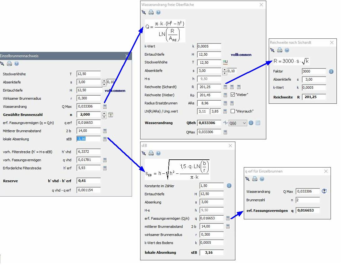 Nach diesem Muster entstanden schließlich zahlreiche Dialoge, die Berechnungen aus dem Bereich der Grundwasserabsenkung miteinander verknüpfen. Es kann eine vollständige Vordimensionierung (die auf dem Einzelbrunnennachweis beruht) durchgeführt und gedruckt werden.