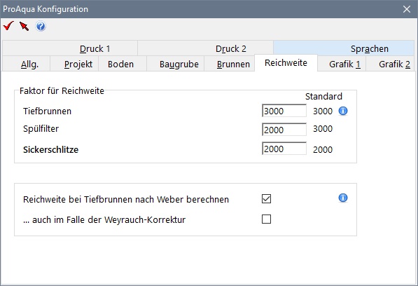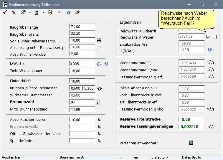 Es kann jetzt gewählt werden, ob die Reichweite nach Sichardt oder nach Weber berechnet werden soll. Bei der halbgespannten Oberfläche und bei Sickerschlitzen erfolgt die Berechnung der Reichweite wie auch bisher nach Sichardt.