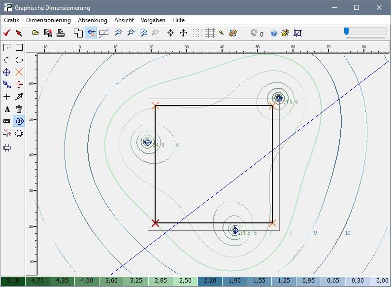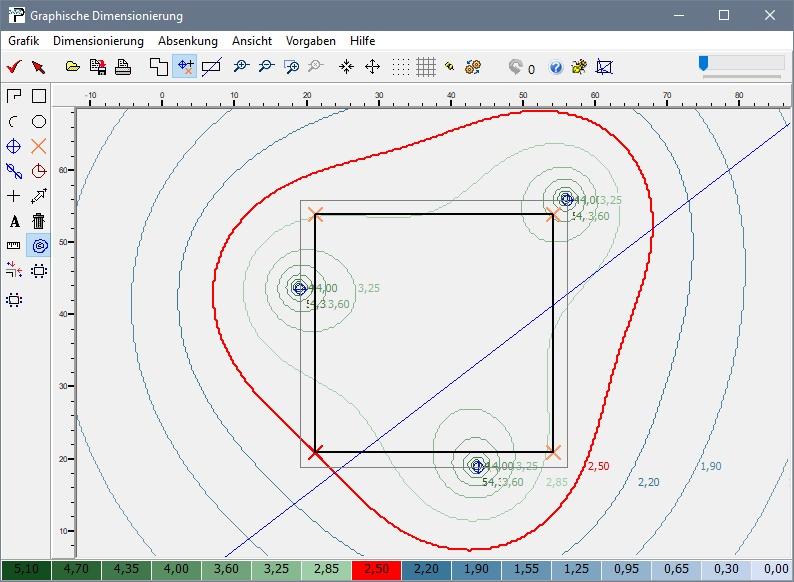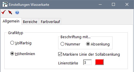 In der Darstellung der "Wasserkarte" mit Iso-Linien kann jetzt für die Bemessungsabsenkung eine vom Farbverlauf abweichende Farbe gewählt werde. Dadurch wird der Bereich, in dem eine bestimmte Absenkung erreicht oder überschritten wird, deutlich hervorgehoben. Die Vorbelegung kann in der Konfiguration gewählt und in dem Dialog zur Einstellung der "Wasserkarte" verändert und aktiviert/deaktiviert werden. Seit Version 3.1 kann an die Isolinien statt einer Nummer die Absenkung geschrieben werden.