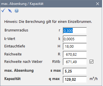 Die maximal mögliche Absenkung und die Kapazität eines Einzelbrunnens können jetzt berechnet werden.