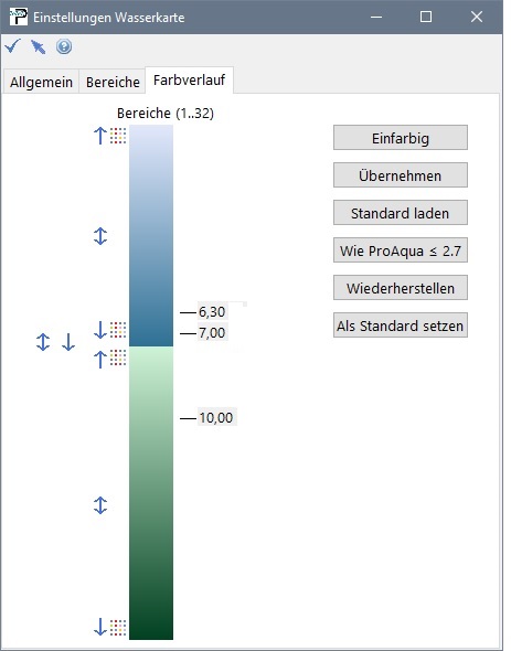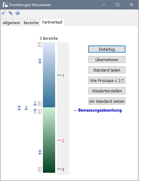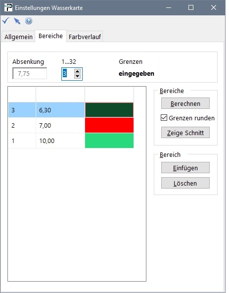 Bisher wurden im Farbverlauf die Bereiche rein geomerisch darstellt. Jetzt wird die Tiefe im Verhältnis zur Brunnentiefe als Kritierium benutzt. In Beispiel 4 wird eine Baugrube mit 3 verschiedenen Absenktiefen betrachtet. Es liegt nahe, diese als Grenzen zu benutzen.