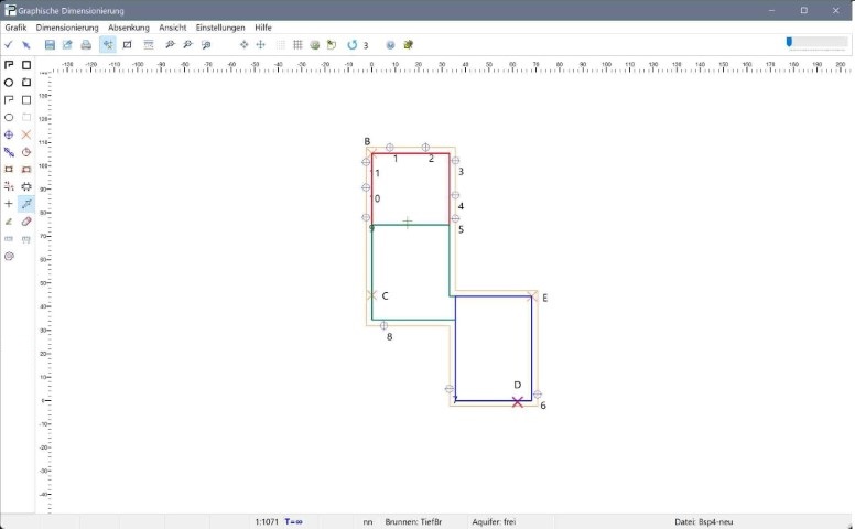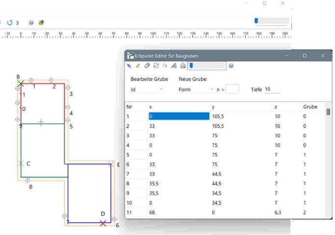 Neu: Es gibt einen Editor, mit man die Eckpunkte der Baugrube eingeben oder editieren kann. Bisher konnten nur Linien mit Anfangs- und Endpunkt editiert werden.