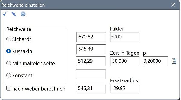 In ProAqua stehen jetzt alle bekannten Reichweitenformeln zur Auswahl. Ein neuer Toolbutton ist überall dort zu finden, wo die Reichweite relevant ist.