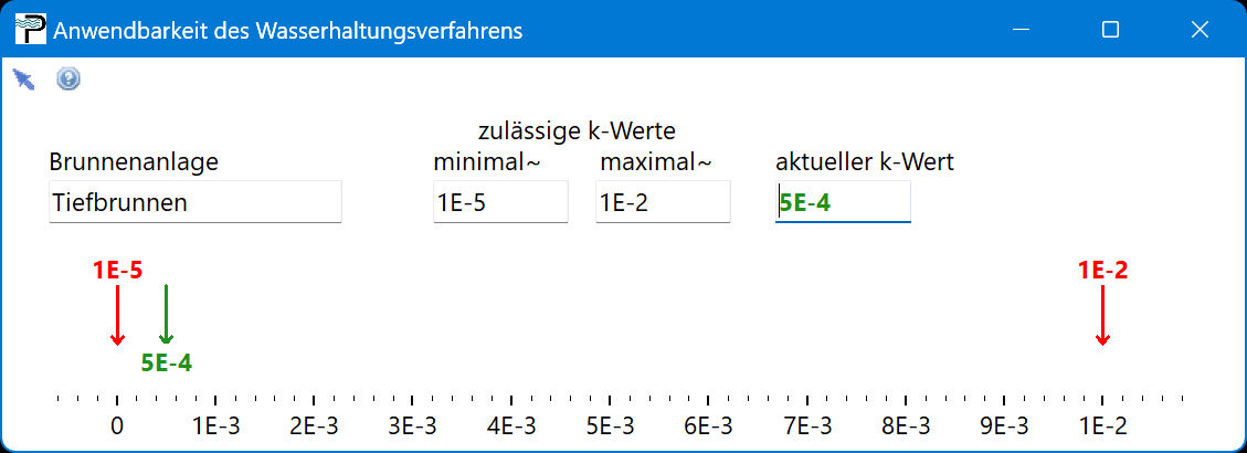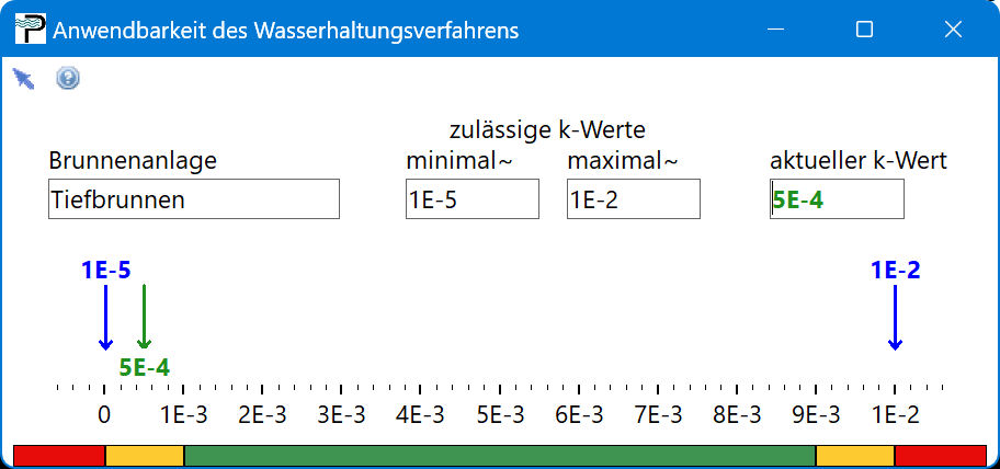 Seit Version 2.9 (24.04.14) gibt es einen Dialog, der z. B. für Tiefbrunnen den aktuellen k-Wert und das Intervall zeigt, in dem er liegen sollte. In der Version 2.8 gab es nur ein Ampelsymbol und nach einem Klick wurde eine Hilfeseite angezeigt. Es ist keine große Änderung, aber die Rückmeldung, ob diese Grenzen eingehalten werden, ist jetzt noch deutlicher.