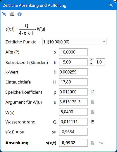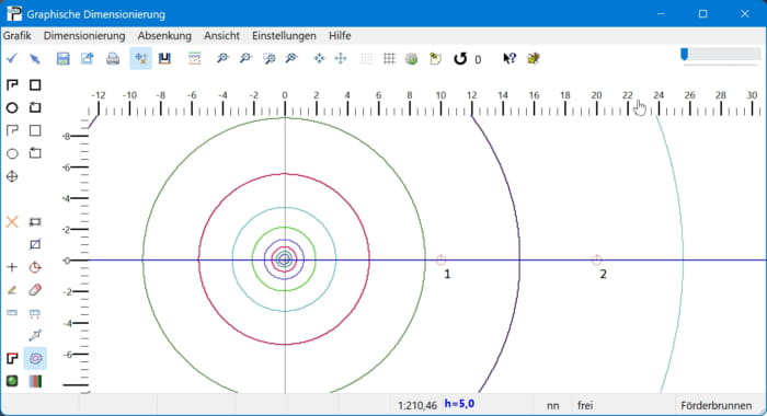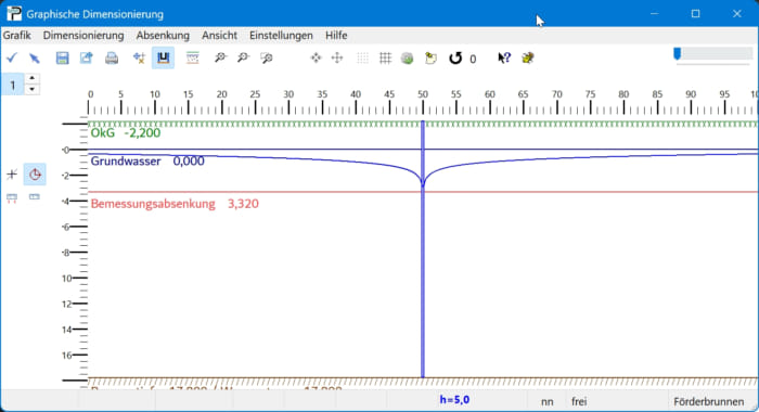 Förderbrunnen / Beregnungsbrunnen können in der Grafik jetzt ohne Dimensionierungspunkte und ohne Baugrube dimensioniert werden. Ein Föderbrunnen wird auch im Schnitt dargestellt. Wird das Projekt in GwR geladen, so kann auch der Auffüllvorgang grafisch dargestell werden.