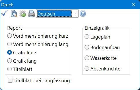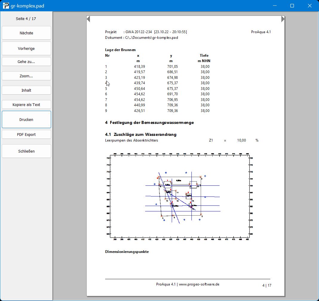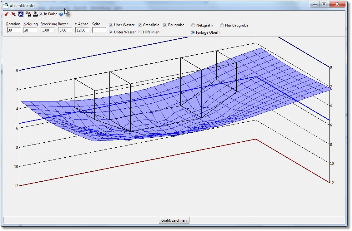 - Farbige Darstellung des Absenktrichters, auch dreidimensional oder entlang einer Schnittlinie.