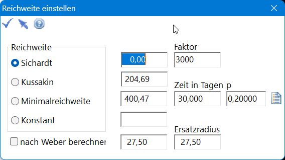 - Die Reichweite kann wahlweise nach Sichardt, Kussakin oder als Minimalreichweite berechnet werden; eine Korrektur nach Weber